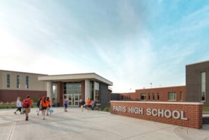 he two school districts of Paris Unit School District No. 95 and Paris Community Unit School District 4 needed to replace their 100-year-old cooperative high school in Paris, Illinois, with a new high school that provides 21st Century Learning Environments. The 134,600 sq. ft. high school is designed for an initial enrollment of 600 with the ability to expand to 900 in the future. The design features STEM Labs, extended learning areas for collaboration, a 500 seat performing arts center auditorium that will be shared with the community, a three-court gymnasium that includes a competition court with bleachers for over 2000 spectators, and modern on-campus dining and food service accommodations. The high school site design includes parking for 500 cars and new athletic field components including football stadium, practice field, track & field event components, baseball field, softball field, and tennis courts. In addition to creating a 21st Century learning environments, both districts were committed to designing a building that is friendly to the environment. The new high school is designed to achieve LEED Silver certification by utilizing an energy efficient geothermal mechanical system, water efficient plumbing systems, recycled and regional building materials, construction waste management, and enhanced indoor environmental quality features. GHR provided complete MEP-FP design services for this project in addition to construction administration.